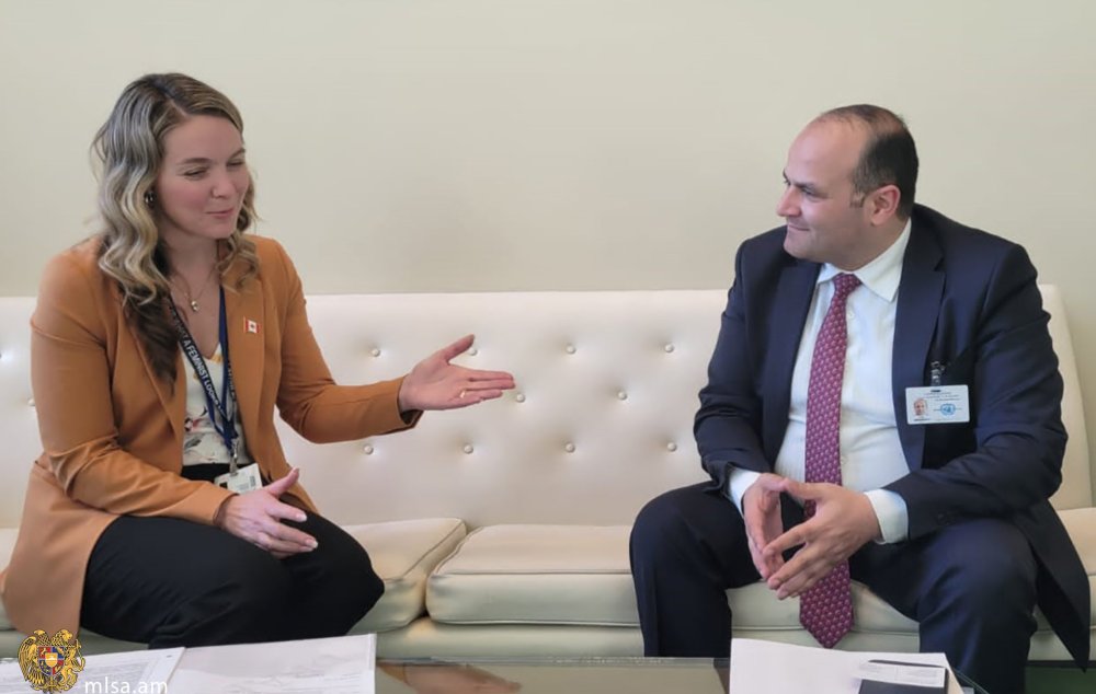 Նյու Յորք կատարած աշխատանքային այցի շրջանակում Աշխատանքի և սոցիալական հարցերի նախարար Նարեկ Մկրտչյանը հանդիպում է ունեցել Կանադայի կանանց, գենդերային հավասարության և երիտասարդության հարցերով նախարարի խորհրդարանական քարտուղար Ջեննա Սադսի հետ։