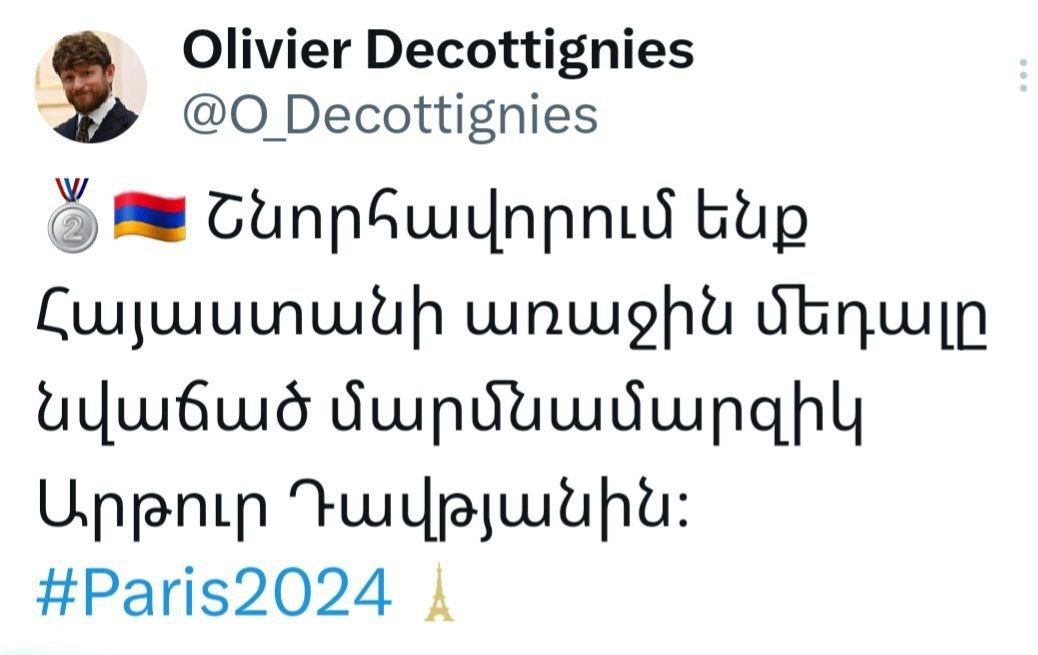 Հայաստանում Ֆրանսիայի դեսպան Օլիվյե Դըկոտինյին շնորհավորել է Հայաստանի առաջին օլիմպիական մեդալի նվաճման կապակցությամբ։