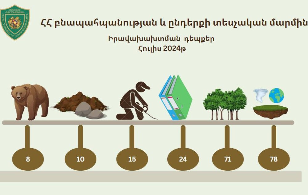ՀՀ բնապահպանության և ընդերքի տեսչական մարմնի 2024 թվականի հուլիս ամսվա ընթացքում կատարված աշխատանքների վերաբերյալ ՀՀ օրենսդրությամբ սահմանված դեպքերում և կարգով իրականացված վերահսկողական և/կամ օրենքով սահմանված այլ գործառույթների իրականացման ընթացքում արձանագրվել է 231 դեպք: