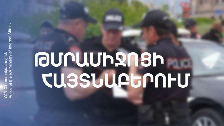 Նույն օրը Երևանի պարեկները Մաշտոցի պողոտայում հայտնաբերել, թմրանյութ պահելու և օգտագործելու, ինչպես նաև սառը զենք պահելու և կրելու կասկածանքով ձերբակալել և ոստիկանության Կենտրոնական բաժին են տեղափոխել 20-ամյա երիտասարդի: Անձնական խուզարկությամբ նրա մոտ հայտնաբերվել են դեղնականաչավուն զանգվածով և մոխրացված հետքերով կաթուցիչներ ու ծալովի դանակներ: