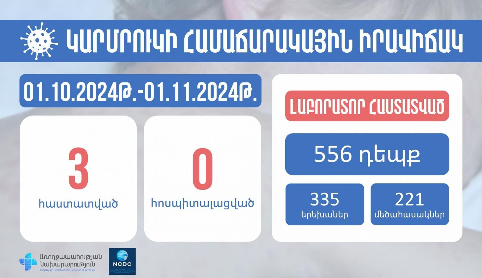 2024-ին հաստատվել է կարմրուկով վարակման 556 դեպք, որոնցից 335-ը՝ երեխա, 221-ը՝ մեծահասակ: