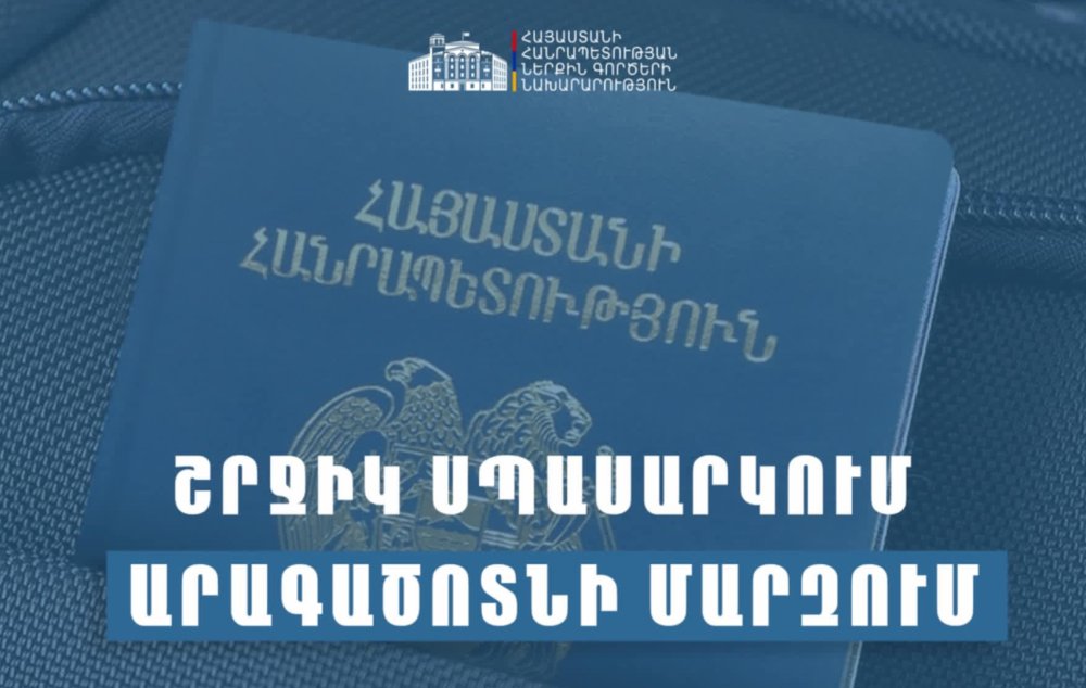 ՆԳՆ Միգրացիայի և քաղաքացիության ծառայության աշխատանքներն առավել արդյունավետ կազմակերպելու, քաղաքացիներին մատուցվող ծառայություններն առավել հասանելի դարձնելու, ինչպես նաև ԼՂ-ից բռնի տեղահանված անձանց՝ ՀՀ քաղաքացիություն ստանալու վերաբերյալ դիմումների ընդունմանն աջակցելու նպատակով նոյեմբերի 11-13-ը շրջիկ ձևաչափով ծառայություններ կմատուցվեն Արագածոտնի մարզում։