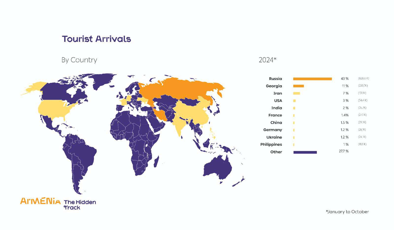 Դեպի Հայաստան առավել շատ զբոսաշրջային այցելություններ գրանցվել են Ռուսաստանից (43%), Վրաստանից (11%) և Իրանից (7%):