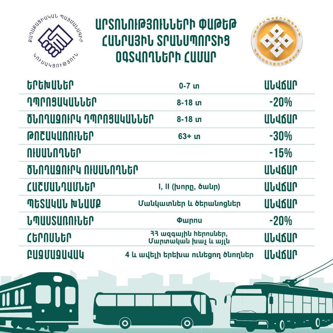 «Քաղաքացիական պայմանագիր» և «Հանրապետություն» խմբակցությունների համատեղ նիստում որոշվել է նոյեմբերի 19-ի ավագանու հերթական նիստում ներկայացնել արտոնությունների փաթեթ՝ հանրային տրանսպորտից օգտվողների համար։