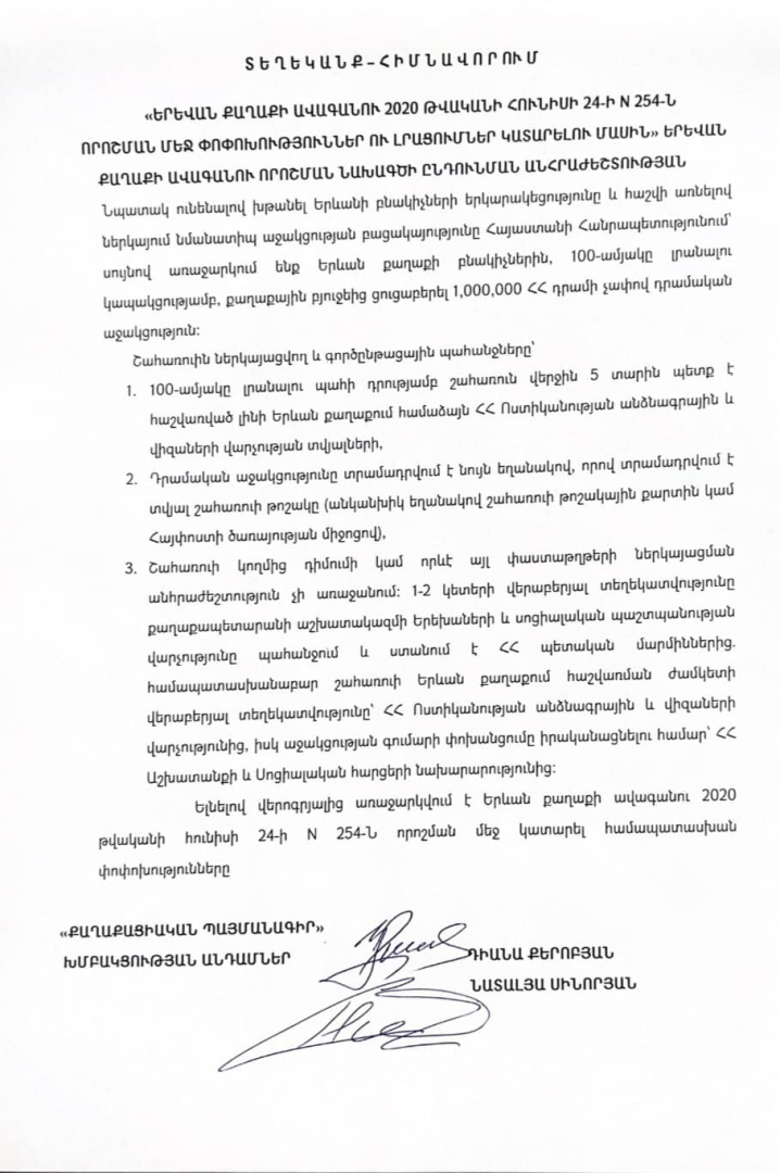 Նախագծի տրամաբանությունն այն է, որ 100 տարին լրացած վերջին 5 տարին Երևան քաղաքում հաշվառված մեր քաղաքացիները՝ Երևան համայնքի կողմից միանվագ 1 մլն. դրամ դրամական օժանդակություն կստանան: