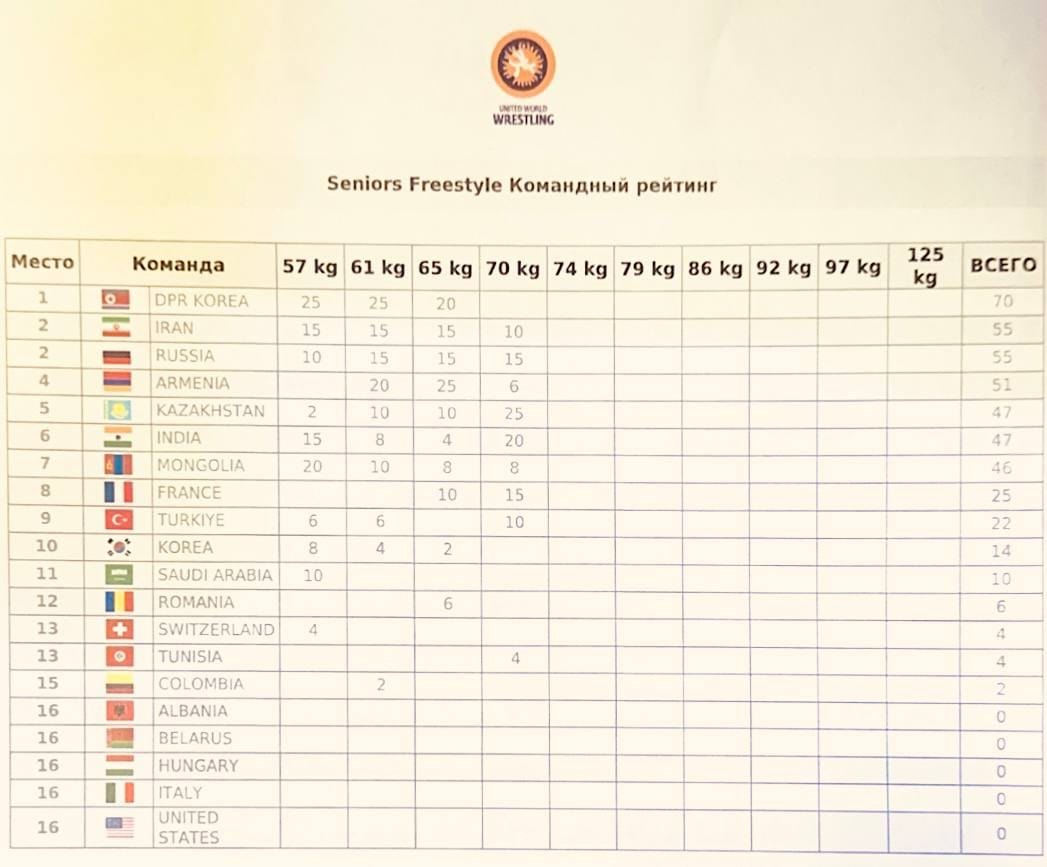 Այս պահի դրությամբ Ըմբշամարտի զինվորականների աշխարհի առաջնության թիմային աղյուսակում ՀՀ ԶՈՒ հավաքականը հունահռոմեական ոճում զբաղեցնում է 1-ին հորիզոնականը, ազատ ոճում՝ 4-րդը: