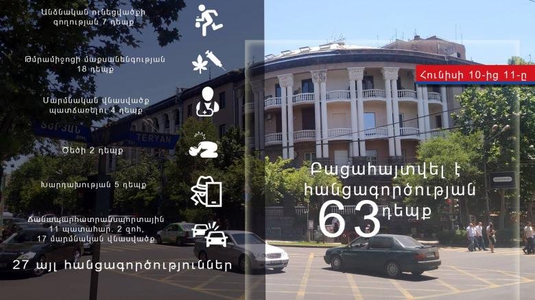 Ըստ ոստիկանության օպերատիվ հաղորդագրությունների ամփոփագրերի` հունիսի 10-ից 11-ը Հայաստանի Հանրապետության ոստիկանության ստորաբաժանումները բացահայտել են հանցագործության 63 դեպք, որից 3 -ը՝ նախկինում կատարված։