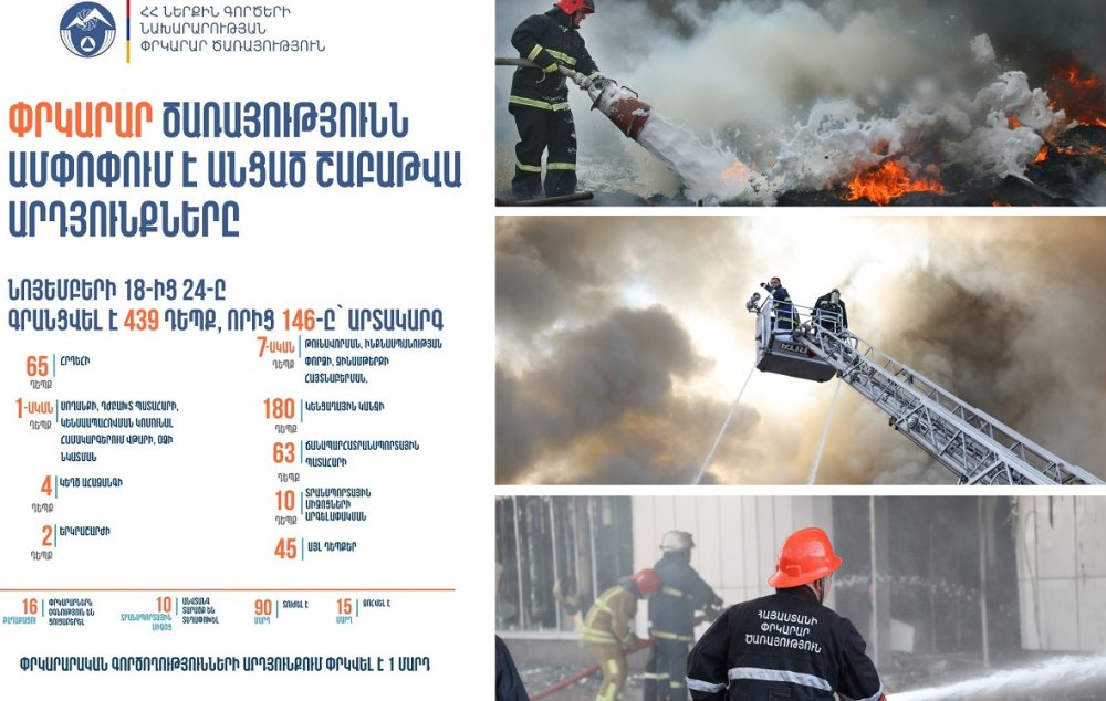 Նոյեմբերի 18-24-ը ՆԳՆ ՓԾ ճգնաժամային կառավարման ազգային կենտրոնում գրանցվել է 439 դեպք, որից 146-ը՝ արտակարգ: