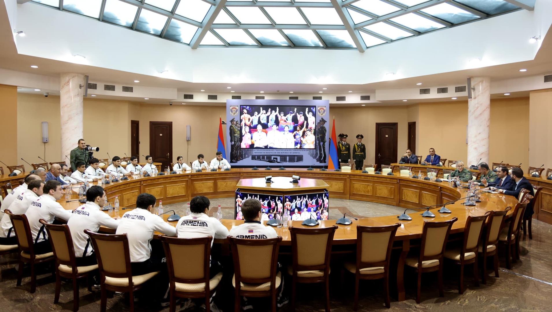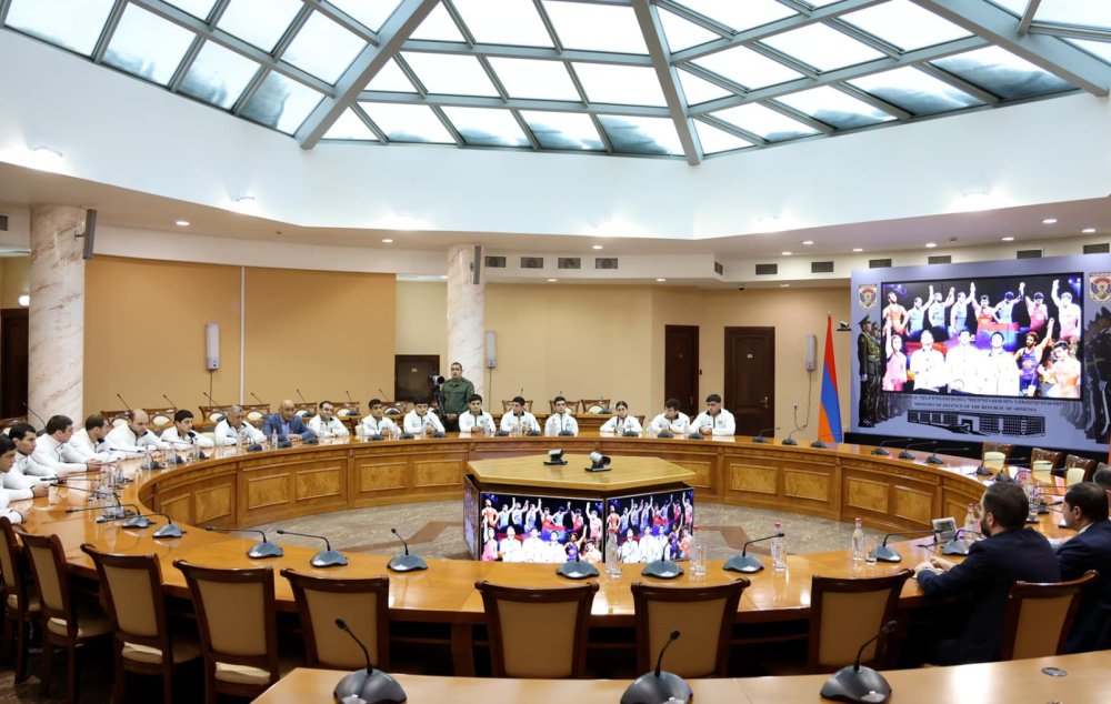 Հանդիպման ավարտին ՀՀ պաշտպանության նախարար Սուրեն Պապիկյանն Ըմբշամարտի զինվորականների աշխարհի 37-րդ առաջնության մասնակից ՀՀ ԶՈՒ հավաքականի անդամներին պարգևատրել է հուշամեդալներով և նվերներով՝ մաղթելով նորանոր հաջողություններ։