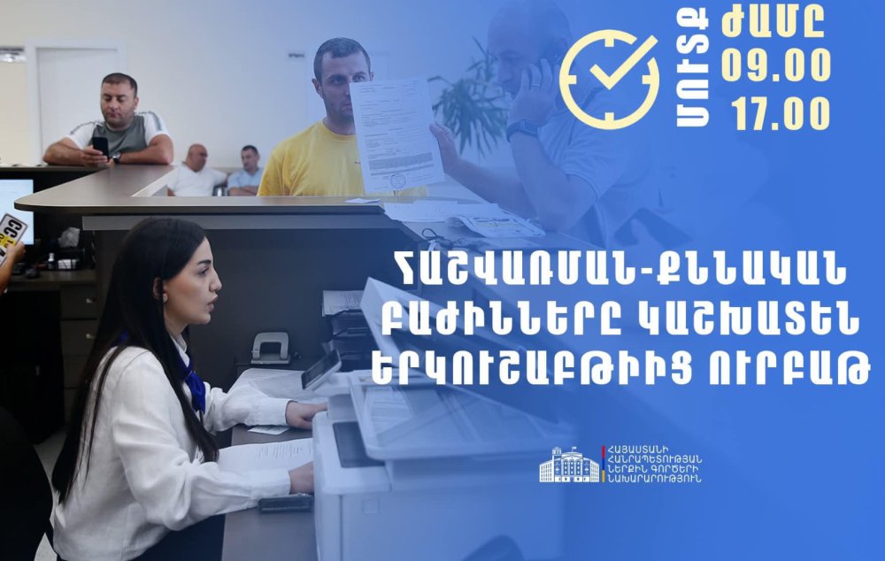Տեղեկացնում ենք, որ հաշվառման-քննական բաժիններն աշխատում են երկուշաբթիից ուրբաթ՝ ժամը 09:00-18:00-ը (քաղաքացիների մուտքը՝ ժամը 09:00-17:00-ը)»,- ասված է հաղորդագրության մեջ։