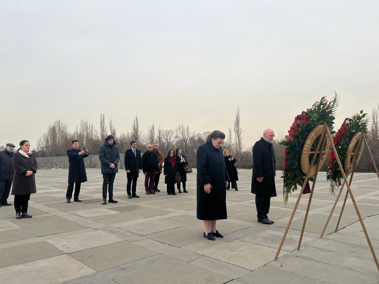 Հունաստանի մշակույթի նախարար Լինա Մենդոնին և ԱԳ նախարարի տեղակալ Կոնստաս Ֆրագոյաննիսը ծաղկեպսակներ են դրել Հայոց ցեղասպանության զոհերի հիշատակը հավերժացնող հուշակոթողին, այնուհետև հյուրերը ծաղիկներ են դրել անմար կրակի մոտ և մեկ րոպե լռությամբ հարգել Հայոց ցեղասպանության անմեղ զոհերի հիշատակը: