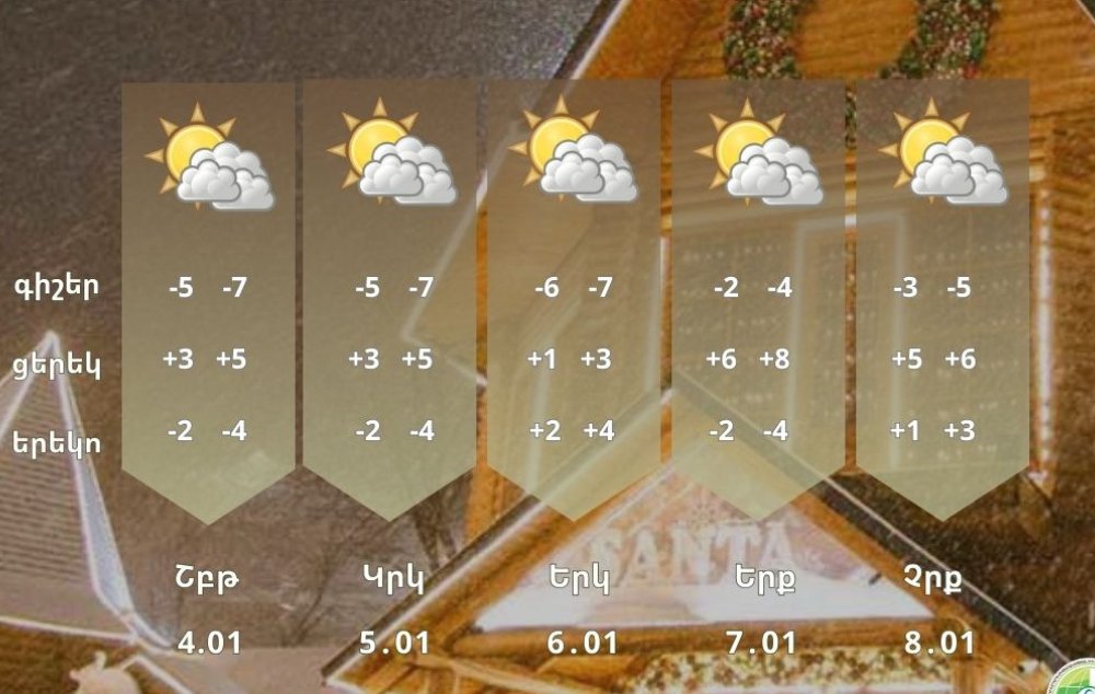 Մարզերում հունվարի 3-ի ցերեկը, 4-8-ին սպասվում է առանց տեղումների եղանակ: Քամին՝ հյուսիսարևմտյան 2-4մ/վ։ Օդի ջերմաստիճանն էապես չի փոխվի։