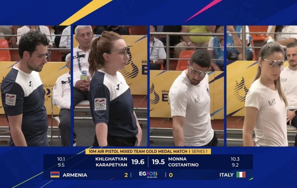 Լեհաստանում ընթացող Եվրոպական խաղերում հունիսի 23-ին «ատրճանակ» ձևի մարզիկներ Բենիկ Խլղաթյանը (289 միավոր) և Էլմիրա Կարապետյանը (292 միավոր) 10մ, 30+30 կրակոց թիմային միքս վարժությունում միասին խոցելով 581 միավոր՝ անցել են եզրափակիչ: Եզրափակչում զիջելով միայն Իտալիայի թիմին՝ հրաձիգները դարձել են արծաթե մեդալակիր: Այս մասին տեղեկացնում են ԿԳՄՍՆ-ից: