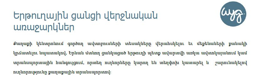 «Ինչ վերաբերում է մարզային ուղևորափոխադրողներին, ապա այստեղ մեկ այլ գլոբալ խնդիր ունենք, քանի որ այսօր այդ ուղևորափոխադրողները ուղևորներին հասցնում են մինչև Երևանի կենտրոնական հատվածներ, ինչն այդքան էլ ճիշտ մոտեցում չէ։ Ճիշտ մոտեցումն այն է, որ միջմարզային ուղևորափոխադրում իրականացնող տրանսպորտը պետք է կանգնի ավտոկայանում, որտեղից ուղևորն արդեն օգտվի Երևանի ներքաղաքային տրանսպորտից»։