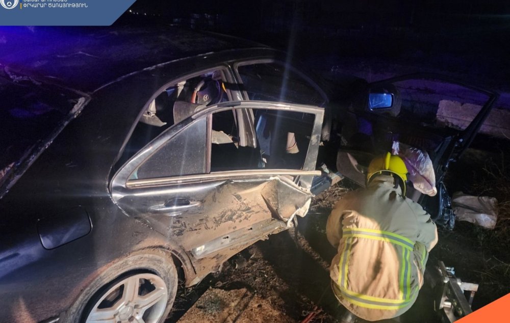 Դեպքի վայր է մեկնել ՆԳՆ ՓԾ մարզային փրկարարական վարչության հրշեջ-փրկարարական ջոկատից մեկ մարտական հաշվարկ: Պարզվել է, որ Վեդի-Երևան ավտոճանապարհի 18-րդ կմ-ին Mercedes-Benz մակնիշի ավտոմեքենան (վարորդ` Է. Ի., ծնված 1980 թ․) դուրս է եկել ճանապարհի երթևեկելի հատվածից և բախվել գովազդային վահանակի սյանը․ կան արգելափակված քաղաքացիներ։