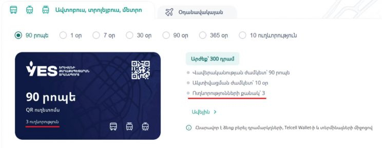 Իրականում, քաղաքային իշխանությունը 300 դրամ արժողությամբ ուղևորատոմս առաջարկում է 3 ուղևորության համար, որի ներկայիս 90 րոպե օգտագործման ժամկետը Երևանի ավագանու փետրվարի 11-ի հերթական նիստի ժամանակ առաջարկվելու է փոփոխել և դարձնել 180 րոպե: