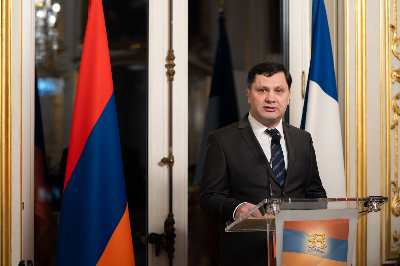 Ընդունելության մասնակիցներին ուղղված իր խոսքում Ֆրանսիայում ՀՀ դեսպան Արման Խաչատրյանը, շնորհավորելով ՀՀ զինված ուժերի 33-րդ տարեդարձը, նշել է, որ Հայոց բանակը մարմնավորում է Հայաստանի Հանրապետությունը պաշտպանելու մեր ժողովրդի վճռականությունը և վերջինիս` որպես անկախ և ժողովրդավար երկիր գոյություն ունենալու իրավունքը։ Ընդգծել է, որ կազմավորման առաջին իսկ պահից ՀՀ Զինված ուժերը վճռորոշ նշանակություն են ունեցել Հայաստանի ինքնիշխանության և տարածքային ամբողջականության պահպանման գործում։