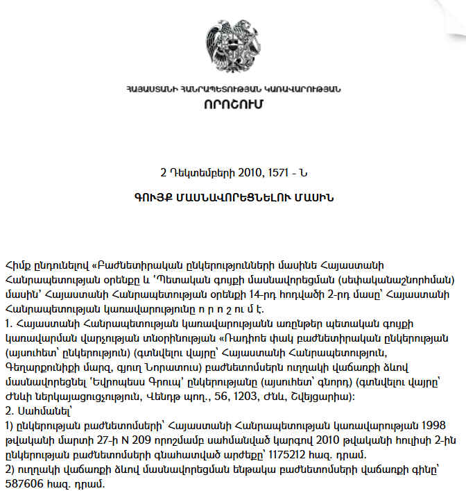 2000-ականների վերջում ընկերությունը հայտնվել էր մասնավորեցման ենթակա պետական գույքի ցանկում․ 2010 թ․ դեկտեմբերի 2-ի կառավարության համապատասխան որոշմամբ այն 587․6 մլն դրամ ուղղակի վաճառքի ձևով օտարվել էր Շվեյցարիայի Ժնև քաղաքում տեղակայված «Եվրոպեսս Գրուպ» կոչվող ընկերությանը: