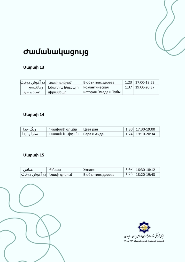 ՀՀ-ում ԻԻՀ դեսպանության մշակույթի կենտրոնից հայտնում են, որ կենտրոնի հովանավորությամբ Երևանում մարտի 13-15-ը կանցկացվի «Իրանական ֆիլմերի օրերը» միջոցառումը։