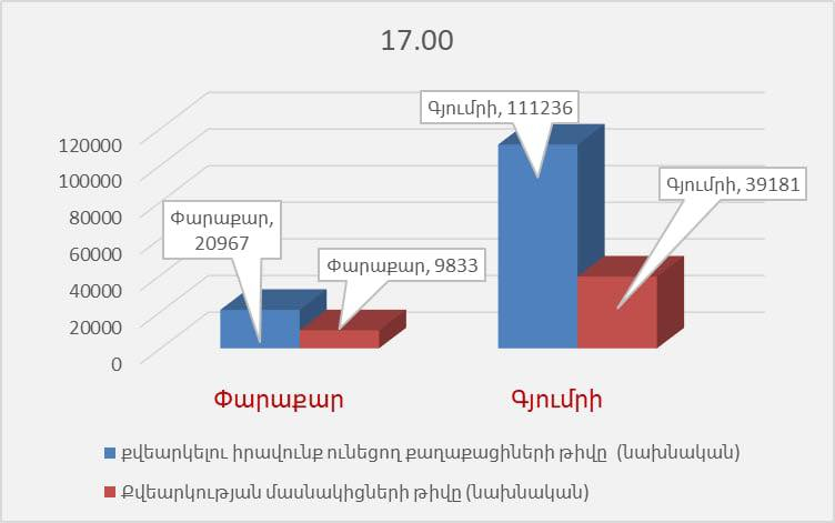 Ժամը 17:00-ի դրությամբ, Արմավիրի մարզի Փարաքար համայնքի ավագանու ընտրություններին մասնակցել է 9833 ընտրական իրավունք ունեցող անձ կամ ընտրողների 46.90%-ը: Փարաքարում ընտրական իրավունք ունի 20967 անձ: