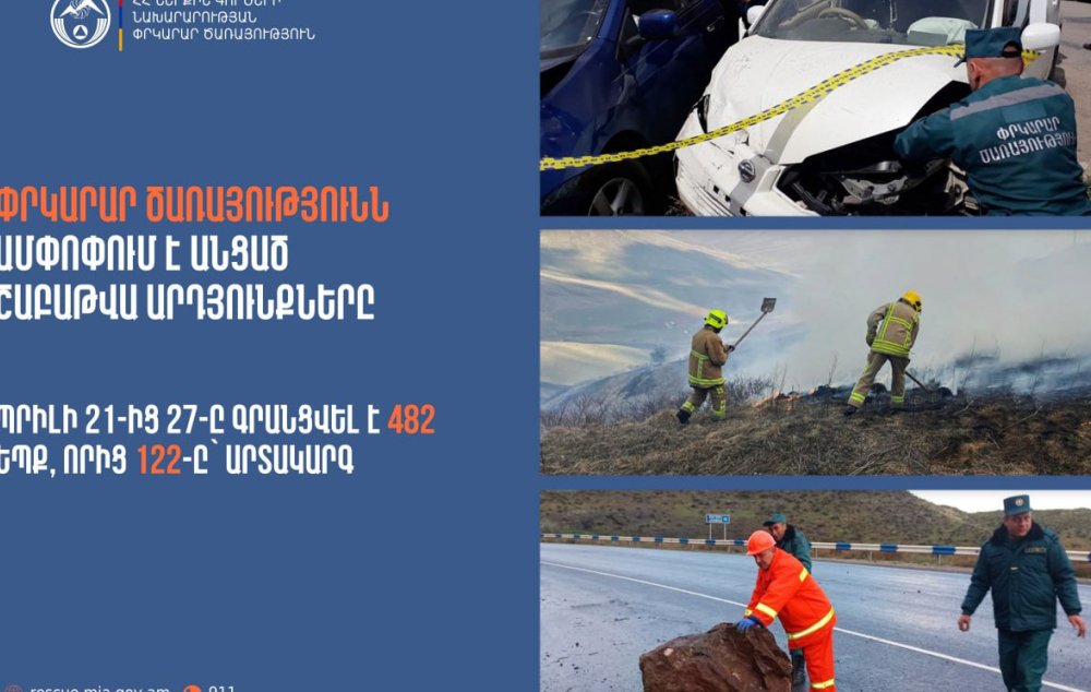 Ապրիլի 21-27-ը ՆԳՆ ՓԾ ճգնաժամային կառավարման ազգային կենտրոնում գրանցվել է 482 դեպք, որից 122-ը՝ արտակարգ: Այս մասին տեղեկացնում է ՆԳՆ Փրկարար ծառայությունը: