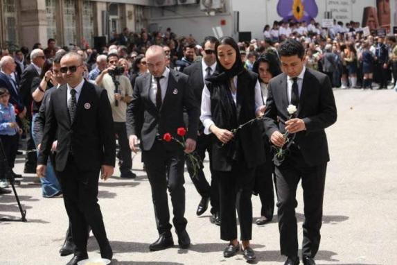 Ծաղիկների խոնարհման ընթացքում, երբ ՀՀ դեսպանության պատվիրակությունը շարժվում է դեպի հուշարձան, հանկարծ կարգապահներից անցնելով պատվիրակության կողմն են հարձակվում երկու-երեք կանայք, որոնք մոտենալով ՀՀ Դեսպանին ու նրա տիկնոջը և ընկերակցողներին, ջանում են նրանց ձեռքերին հարվածելով խլել մատուցման համար նախատեսված ծաղիկները:
