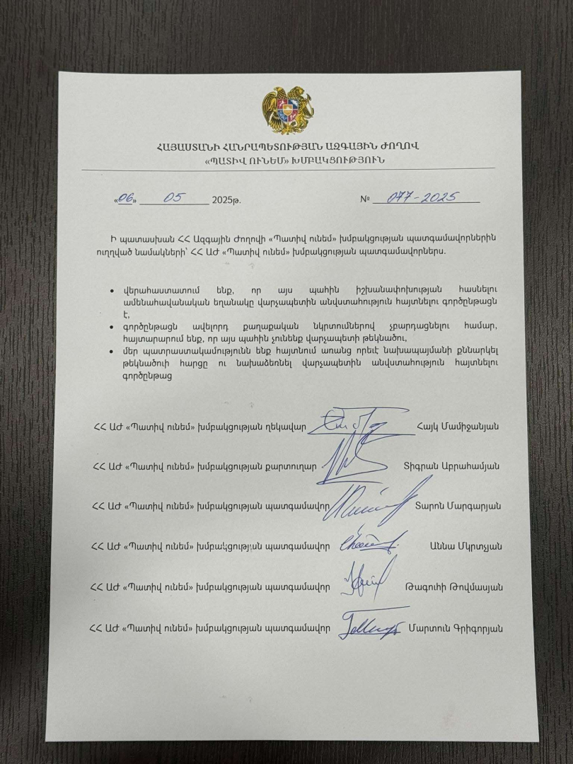 «Վերահաստատում ենք, որ այս պահին իշխանափոխության հասնելու ամենահավանական եղանակը վարչապետին անվստահություն հայտնելու գործընթացն է։