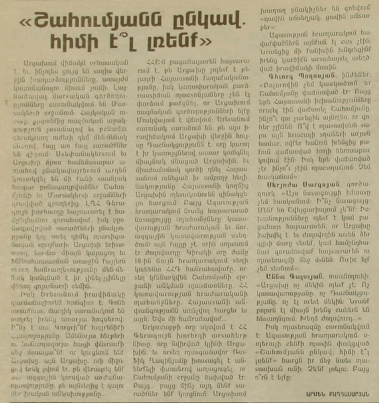 Մեղադրանքները նույնն են․ որ թիկունքից օգնություն չկա, որ Երևանում մարդիկ ապրում են իրենց առօրյա գործերով [ո՞ւր էր կորել համազգային շարժումը, զարթոնքը, ոգին, ո՞նց էին համարձակվում մարդիկ ապրել սովորական կյանքով, առհասարակ ապրել], որ կառավարությունը պնդում է, որ Լեռնային Ղարաբաղը չպետք է թելադրի Հայաստանի քաղաքականությունը և որ ռազմական գործողությունների ելքը Մոսկվայում է որոշվում։ Տարածում են [հոդվածը «Ազգ» օրաթերթից է, որ Ռամկավար ազատականների պաշտոնաթերթն է, նրանք էլ մի բարի պտուղ չէին, պարզապես կուսակցական տարբերություն էր պետք պատկերել], որ վերջին հույսը Դաշնակցությունն է, որը պատերազմի ժամանակ հանրահավաքով պահանջում է կառավարության հրաժարականը։ Իսկ պատգամավոր Ռաֆիկ Ղազինյանը խոստացել է Գերագույն խորհրդի արտահերթ նիստում ապացուցել, որ Շահումյանի շրջանը ծախված էր։