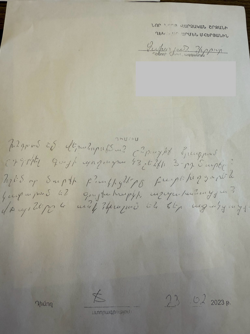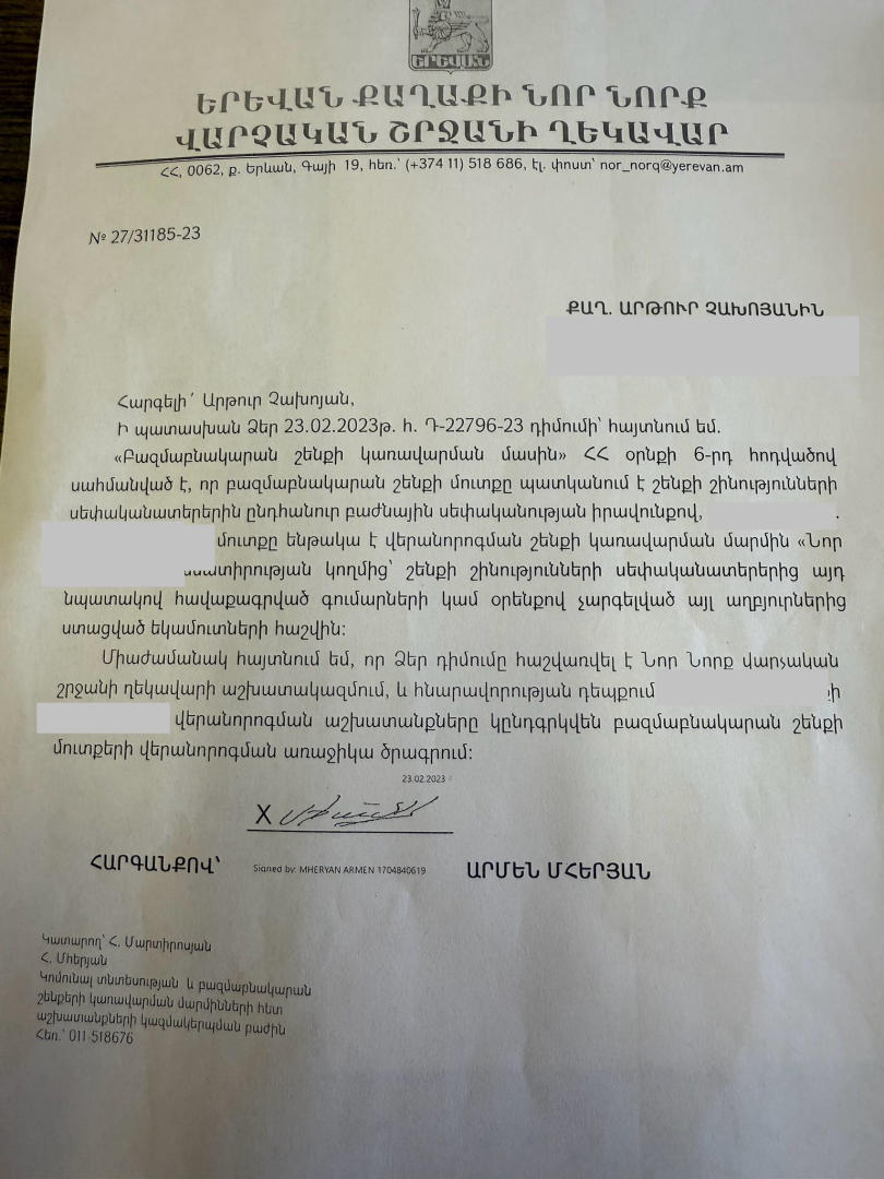 2023 թվականի փետրվարի 23-ին Արթուր Չախոյանը դիմել է Նոր Նորք վարչական շրջանի ղեկավարին՝ իր բնակության հասցեի շենքի մուտքը ներառելու վերանորոգման ընթացիկ ծրագրում։