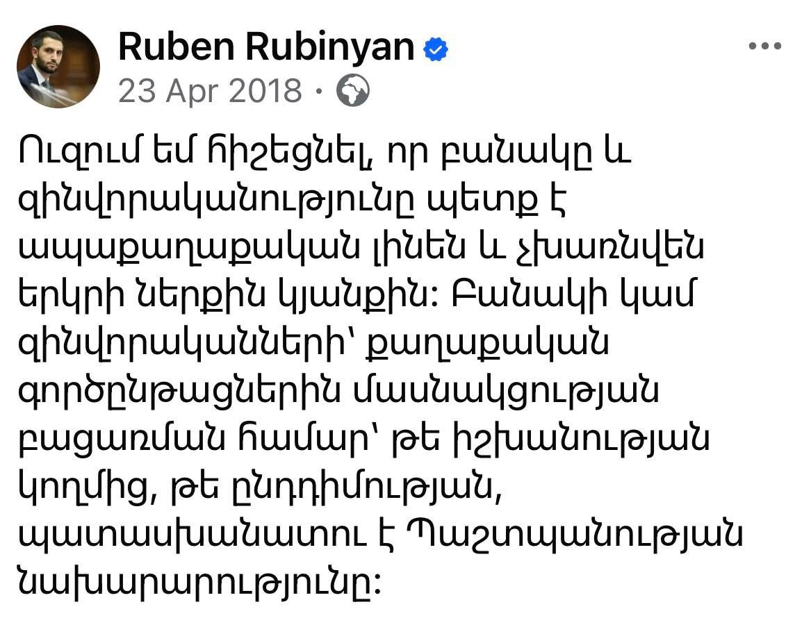 Այս հայտարարությունը ես շարժման անունից արել եմ 2018 թվականի ապրիլի 23-ին, երբ Նիկոլ Փաշինյանը ու մյուսները ձերբակալված էին, փողոցում հարյուր հազարավոր ցուցարարներ կային, իսկ Սերժ Սարգսյանի հրաժարականին, ինչպես հետո պարզվեց, ժամեր էին մնացել: Բայց նույնիսկ այդ իրավիճակում մենք չէինք կարող քաջալերել թեկուզ հանուն մեր պայքարի փողոց դուրս եկած զինվորականությանը: