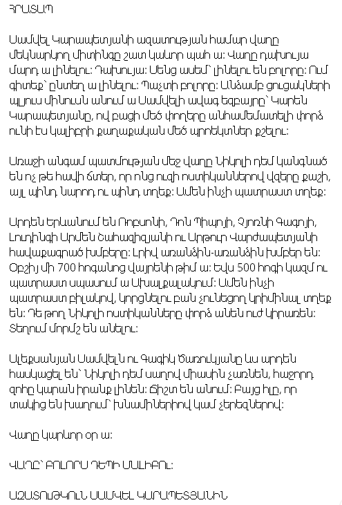 «Առաջի անգամ վաղը Նիկոլի դեմ կանգնած են ոչ թե հավի ճտեր, այլ պինդ տղեք: Ամեն ինչի պատրաստ տղեք: Արդեն Երևանում են Ռոբսոնի, Դոն Պիպոյի, Չոռնի Գագոյի, Լուդինգի Արմեն Շահազիզյանի ու Արթուր Վարժապետյանի խմբերը: Լրիվ առանձին-առանձին խմբեր են: