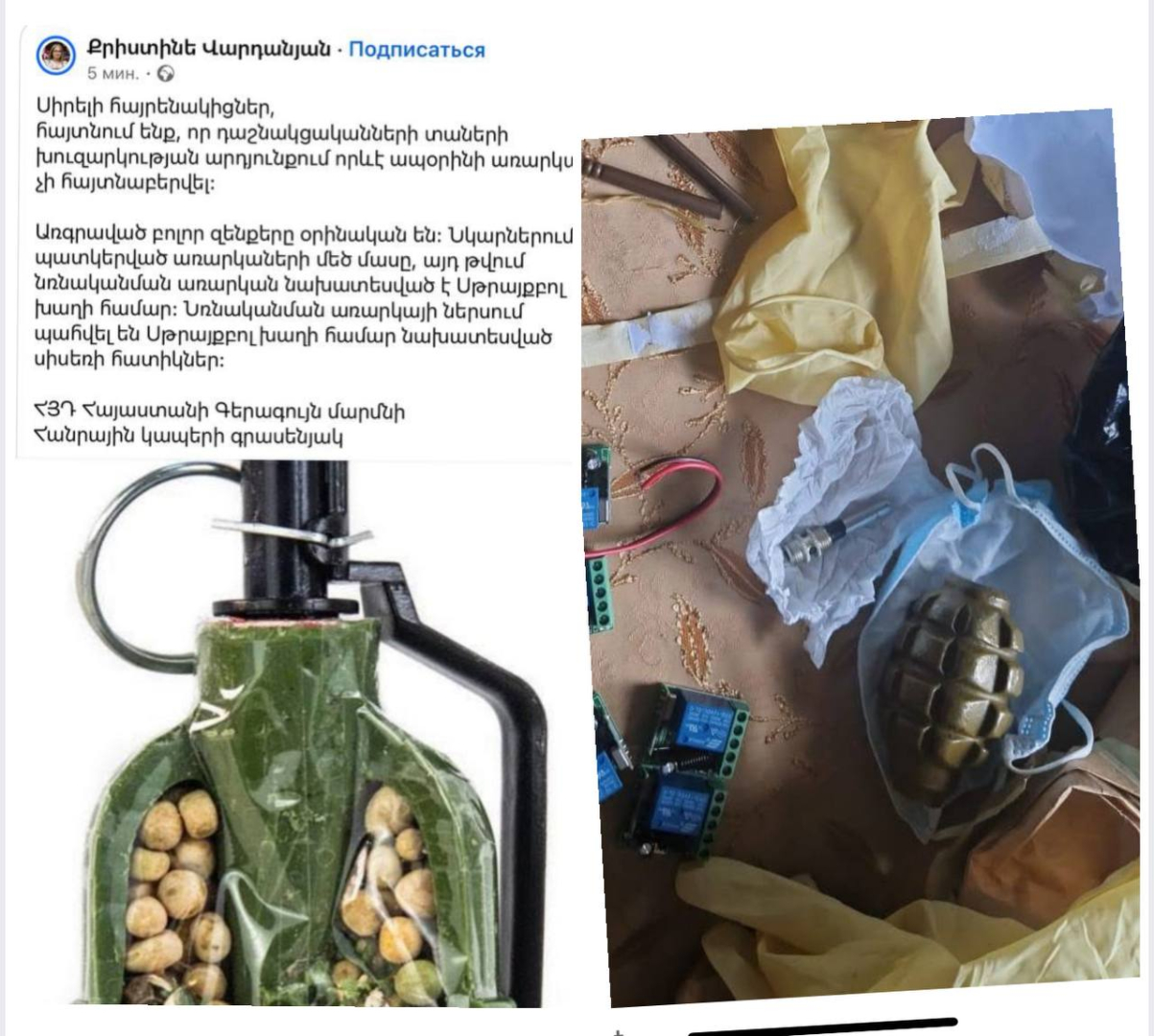 ՔԿ-ն դաշնակների տնից մարտական Ֆ1 նռնակ է գտել (աջ կողմի նկարում), դաշնակ պատգամավորը ինչ-որ խաղալիքի նկար (ձախ կողմի նկարում) է դրել ու ասում է՝ սա սիսեռի հատիկներով սթրայքբոլ խաղալու համար է։