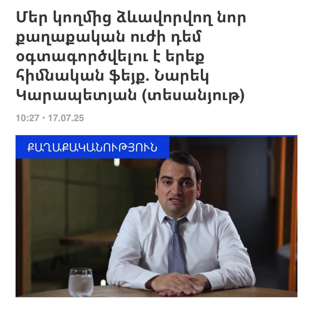 Մեր կողմից ձևավորվող նոր քաղաքական ուժի դեմ օգտագործվող առաջին ֆեյք միջոցը լինելու է այն, որ Ռուսասատանն ուղարկել է Սամվել Կարապետյանին, որպեսզի այստեղ ռուսական ազդեցություն տարածի, հայտարարել է «Տաշիր» ընկերությունների խմբի փոխնախագահ Նարեկ Կարապետյանը: