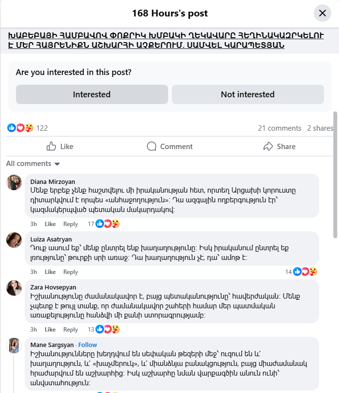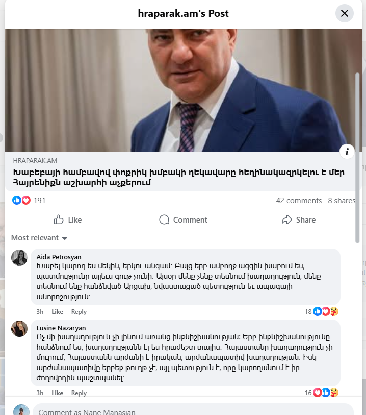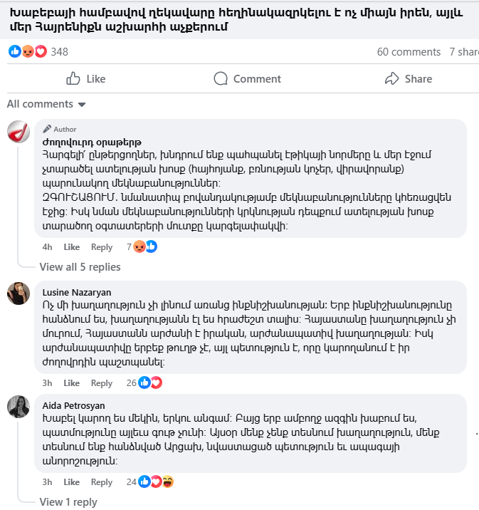 Հատկանշական է նաև, որ միևնույն կեղծ օգտահաշիվը տարբեր ԶԼՄ-ների համապատասխան հրապարակումներում արտատպել է միևնույն մեկնաբանությունը։