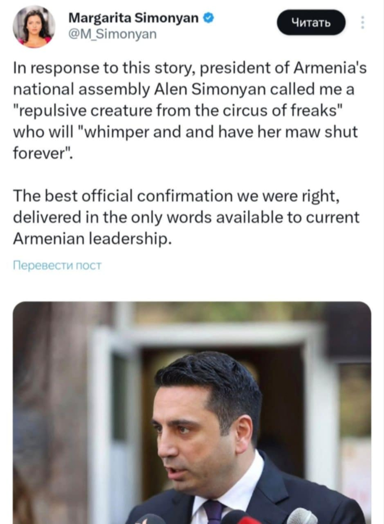 Մարգարիտա Սիմոնյանը քիչ առաջ X-ի իր միկրոբլոգում գրառում էր արել ՀՀ ԱԺ նախագահի մասին` դժգոհելով, որ Ալեն Սիմոնյանն իրեն անվանել էր «կրկեսի նողկալի արարած»։