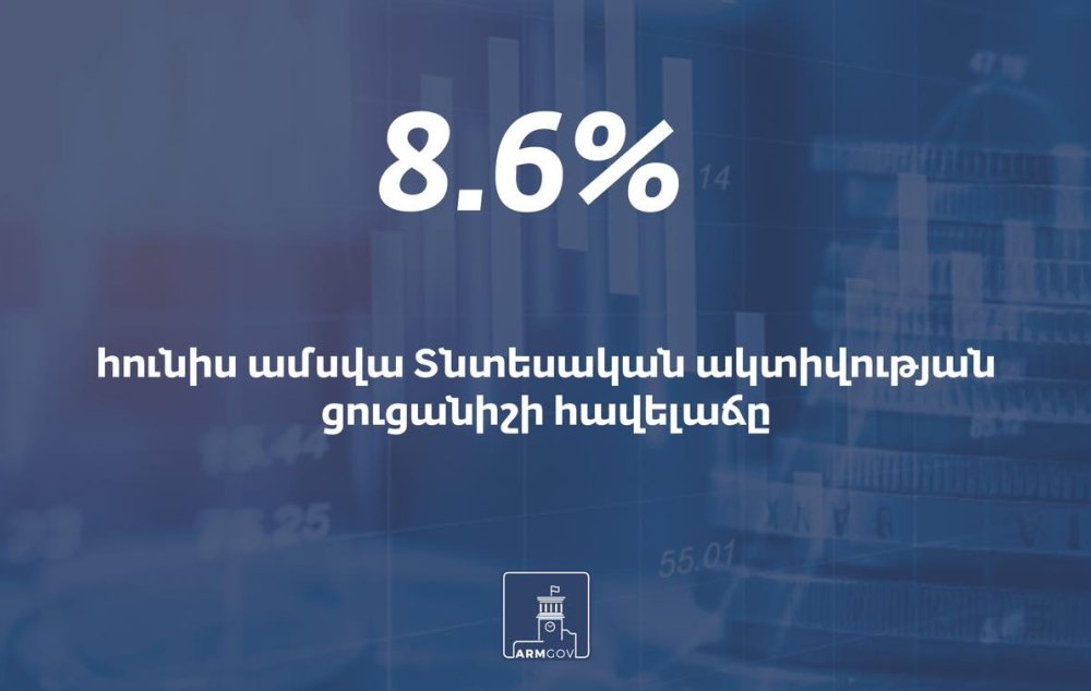 ՀՀ կառավարությունից հայտնում են, որ 2025 թ. հունիսին նախորդ տարվա նույն ամսվա համեմատ Հայաստանում Տնտեսական ակտիվության ցուցանիշի (ՏԱՑ) հավելաճը կազմել է 8.6%, իսկ նախորդ ամսվա համեմատ՝ 8.8%: