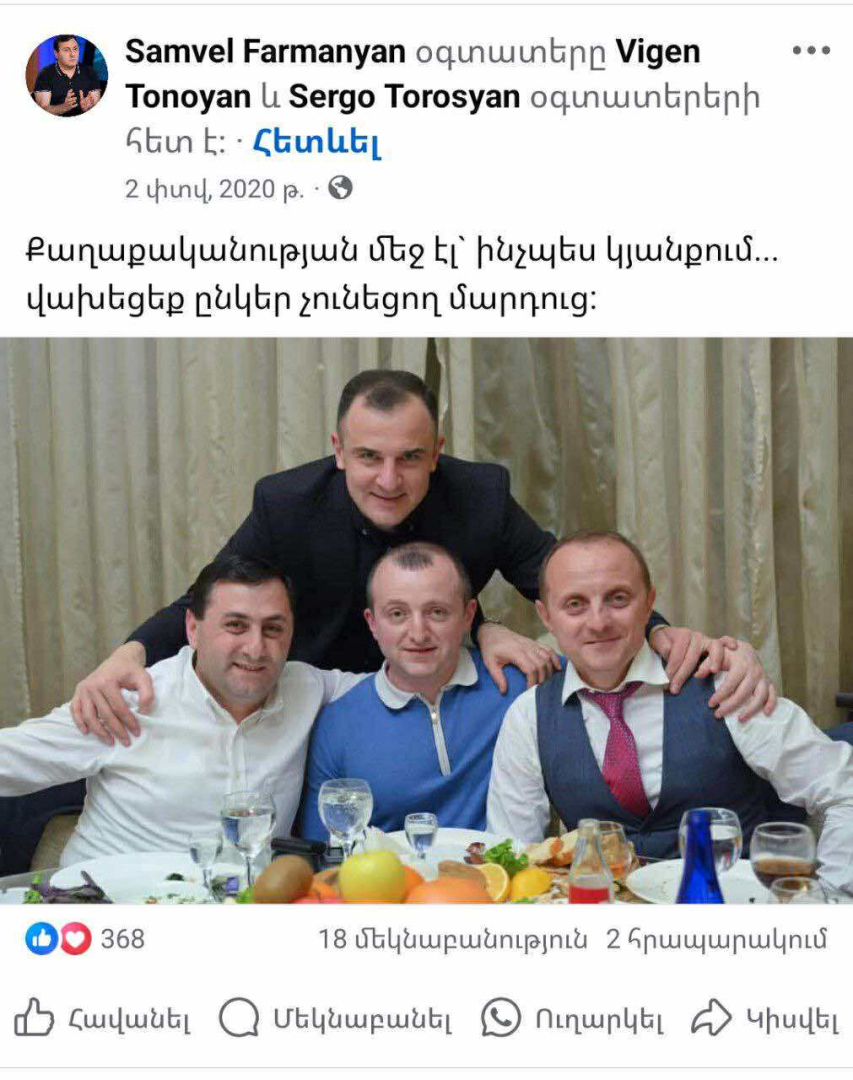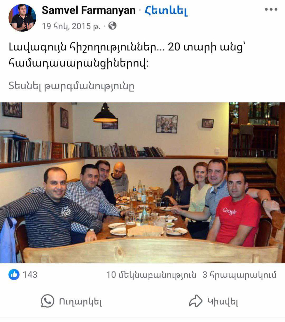 Ֆեյսբուքի այսօրվա հերոսը Սամվել Ֆարմանյանն էր։ Վերջինս «հերոսացավ» նախօրեին իր մի գրառմամբ, որտեղ տեղադրել էր վարչապետ Նիկոլ Փաշինյանի և առաջին տիկին Աննա Հակոբյանի հին լուսանկարներից ու ճղճղիմ բառապաշարով քննարկել վերջիններիս արտաքին տեսքը։