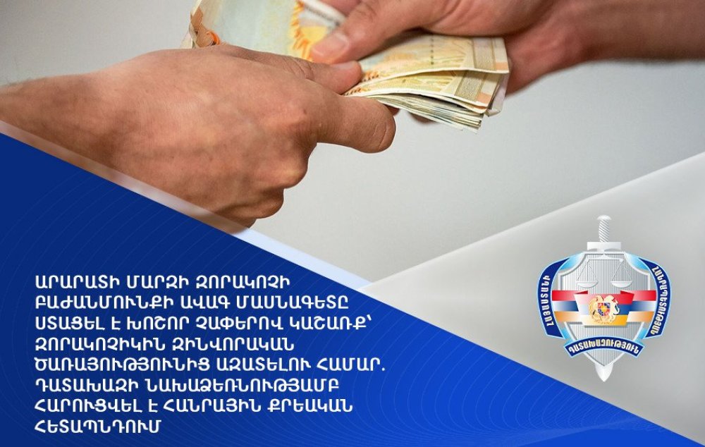 Ա.Թ.-ն, լինելով պաշտպանության նախարարության զորակոչային և զորահավաքային համալրման ծառայության Արարատի մարզի տարածքային ստորաբաժանման զորակոչի բաժանմունքի ավագ մասնագետ, 2023 թվականի մարտ-ապրիլ ամիսներին պահանջել և ստացել է խոշոր չափերով կաշառք: