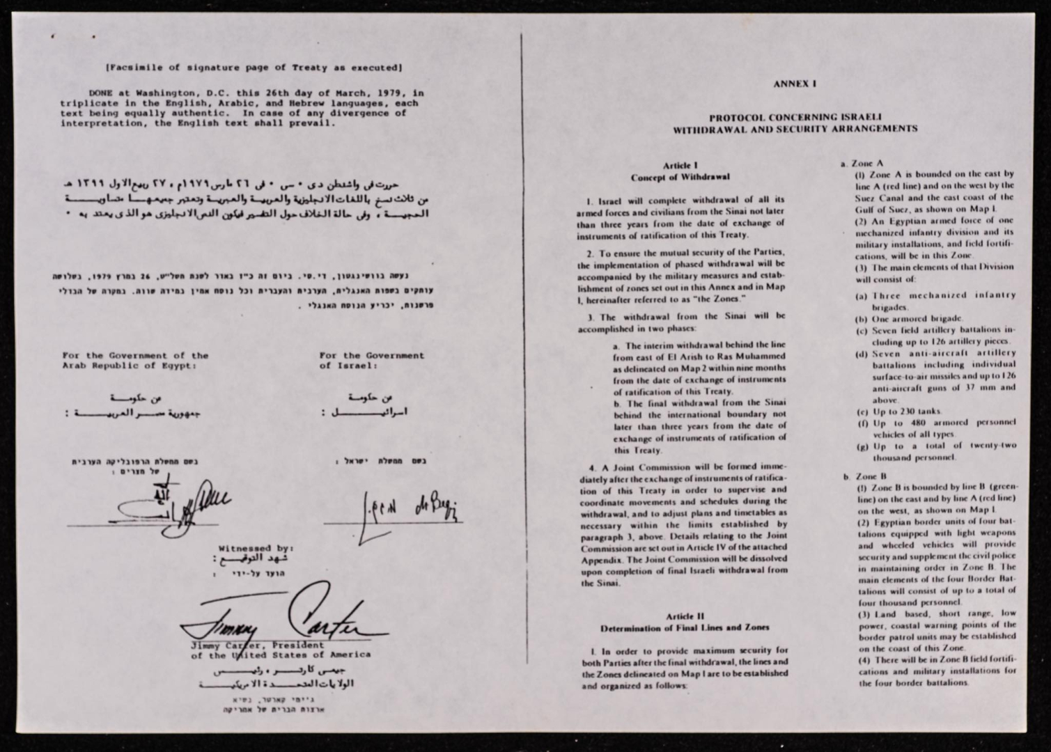 «Կից տեղադրում եմ 1979 թվականի մարտի 26-ին Եգիպտոսի նախագահ Անվար Սադաթի, Իսրայելի վարչապետ Մենախեմ Բեգինի և ԱՄՆ նախագահ Ջիմի Քարտերի միջև ստորագրված եռակողմ արձանագրությունը Սինայի թերակղզուց իսրայելական զինված ուժերի դուրս բերման վերաբերյալ։