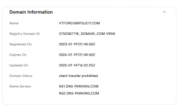Ըստ WHOIS գործիքի, VT Foreign Policy կայքի դոմեյնը գրանցված է 2023 թվականին։