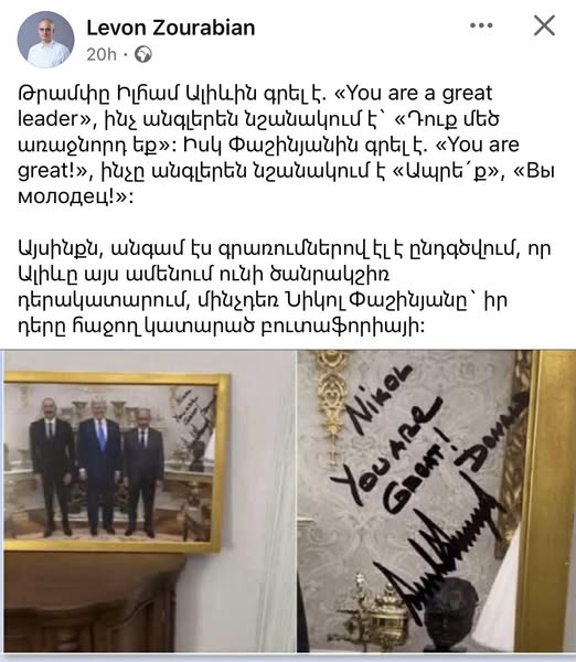 Լավ է չի գրել, «Նիկոլ Փաշինյանի նկարի վրա տեքստի չափերը փոքր են կամ գրիչի գույնը այլ է և դա նշանակում է, որ Թրամփը նրան ավելի վատ է վերաբերվում, քան Ալևին»: