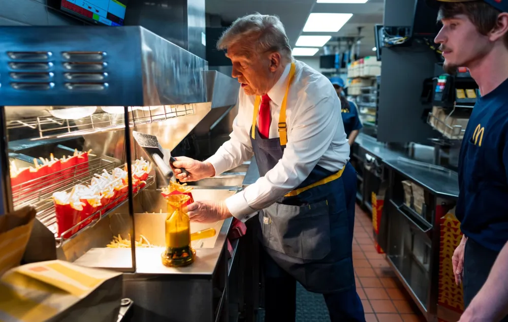 Ընտրարշավի ընթացքում Թրամփը մի քանի ժամով «աշխատանքի էր դուրս եկել» McDonald's-ում. նա հագել էր գոգնոց և սպասարկում էր այցելուներին՝ մատուցելով ֆրի կարտոֆիլ։