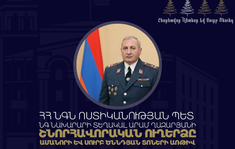 ՀՀ ՆԳՆ ոստիկանության պետ-ներքին գործերի նախարարի տեղակալ, ոստիկանության գնդապետ Արամ Ղազարյանը շնորհավորական ուղերձ է հղել Ամանորի և Սուրբ Ծննդյան տոների առթիվ.
