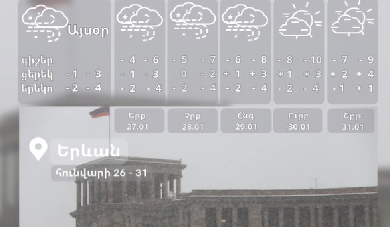 Հունվարի 26-ի ցերեկը, 27-28-ը Շիրակի դաշտի ցածրադիր հատվածներում, Արագածոտնի և Կոտայքի նախալեռներում, Արարատյան դաշտում սպասվում է մառախուղ։ Օդի ջերմաստիճանը հունվարի 27-ի ցերեկը Լոռիում, Տավուշում և Սյունիքում կնվազի 4-6 աստիճանով, հունվարի 28-31-ը ցերեկային ժամերին աստիճանաբար նույնքան կբարձրանա։