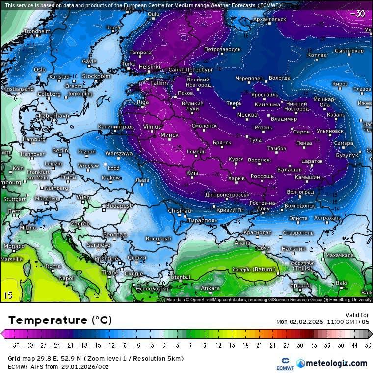 «Ցրտի էպիկենտրոնը կլինի Կենտրոնական Ռուսաստանում, Բելառուսում և Բալթյան երկրներում, որտեղ ջերմաչափերի սյուները կարող են իջնել մինչև -30°C: Փետրվարի 2-ի առավոտյան ջերմաստիճանը նորմայից ցածր կլինի 20 աստիճանով։ Սառնամանիքները կազդեն նաև Ուկրաինայի հյուսիսային շրջանների և դրանց հարակից տարածքների վրա»,- գրել է նա: