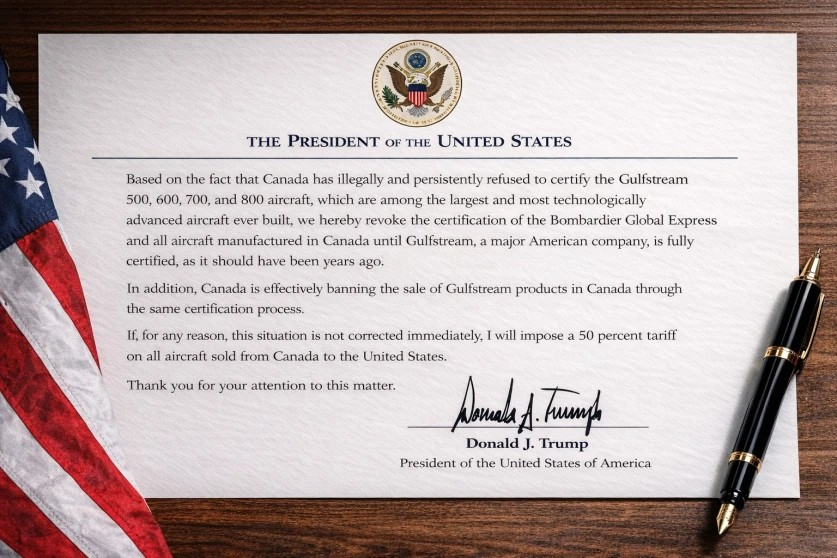 ԱՄՆ առաջնորդը պատճառաբանել է, որ չեղյալ է հայտարարվում Bombardier Global Express-ի և Կանադայում արտադրված բոլոր ինքնաթիռների հավաստագրումը, քանի դեռ Gulfstream-ը՝ ամերիկյան խոշոր ընկերությունը, լիովին հավատարմագրված չէ, ինչպես պետք է լիներ տարիներ առաջ։