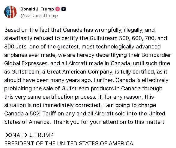 ԱՄՆ նախագահ Դոնալդ Թրամփը հայտարարել է, որ Կանադան անօրինական և համառորեն հրաժարվել է հավաստագրել Gulfstream 500, 600, 700 և 800 ինքնաթիռները, որոնք երբևէ ստեղծված ամենամեծ և տեխնոլոգիապես ամենաառաջադեմ ինքնաթիռներից են։
