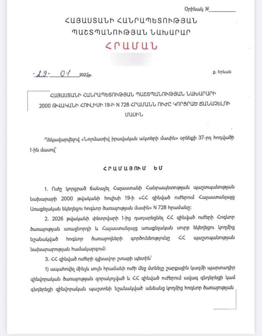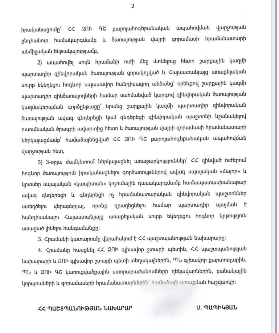 ՀՀ պաշտպանության նախարար Սուրեն Պապիկյանը տարընթերցումներից զերծ մնալու նպատակով հրապարակել է հրամանը, որով կարգավորվում է զինված ուժերում հոգևոր ծառայության կազմակերպումը:
