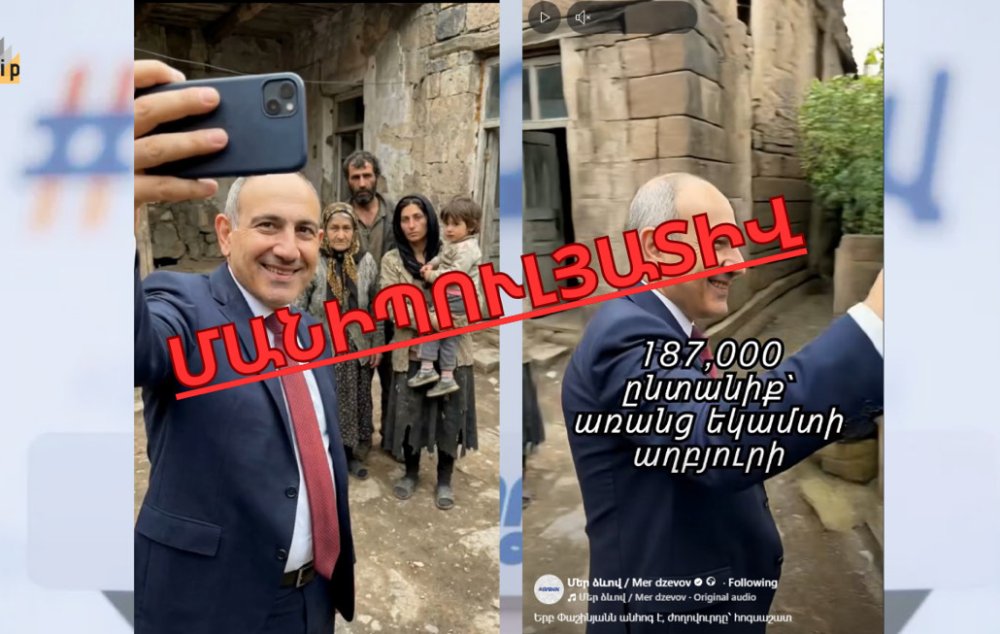 Fip-ը գրում է․ «Մեր ձևով» շարժման ֆեյսբուքյան էջում ակտիվորեն տարածվում է արհեստական բանականության միջոցով գեներացված մի տեսանյութ, որտեղ որպես փաստ ներկայացվում է, թե Հայաստանում 187 հազար ընտանիք ապրում է առանց եկամտի աղբյուրի։