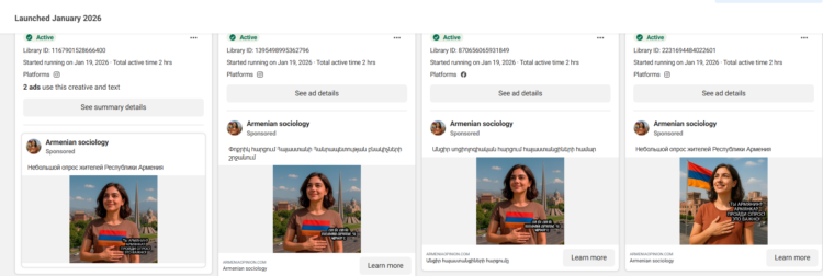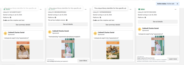 Անհայտ էջերի գովազդները ակտիվ են Meta Ad Library-ում և ունեն տարբեր Library ID-ներ, ինչը նշանակում է, որ դրանք մասշտաբային, ոչ պատահական արշավներ են։